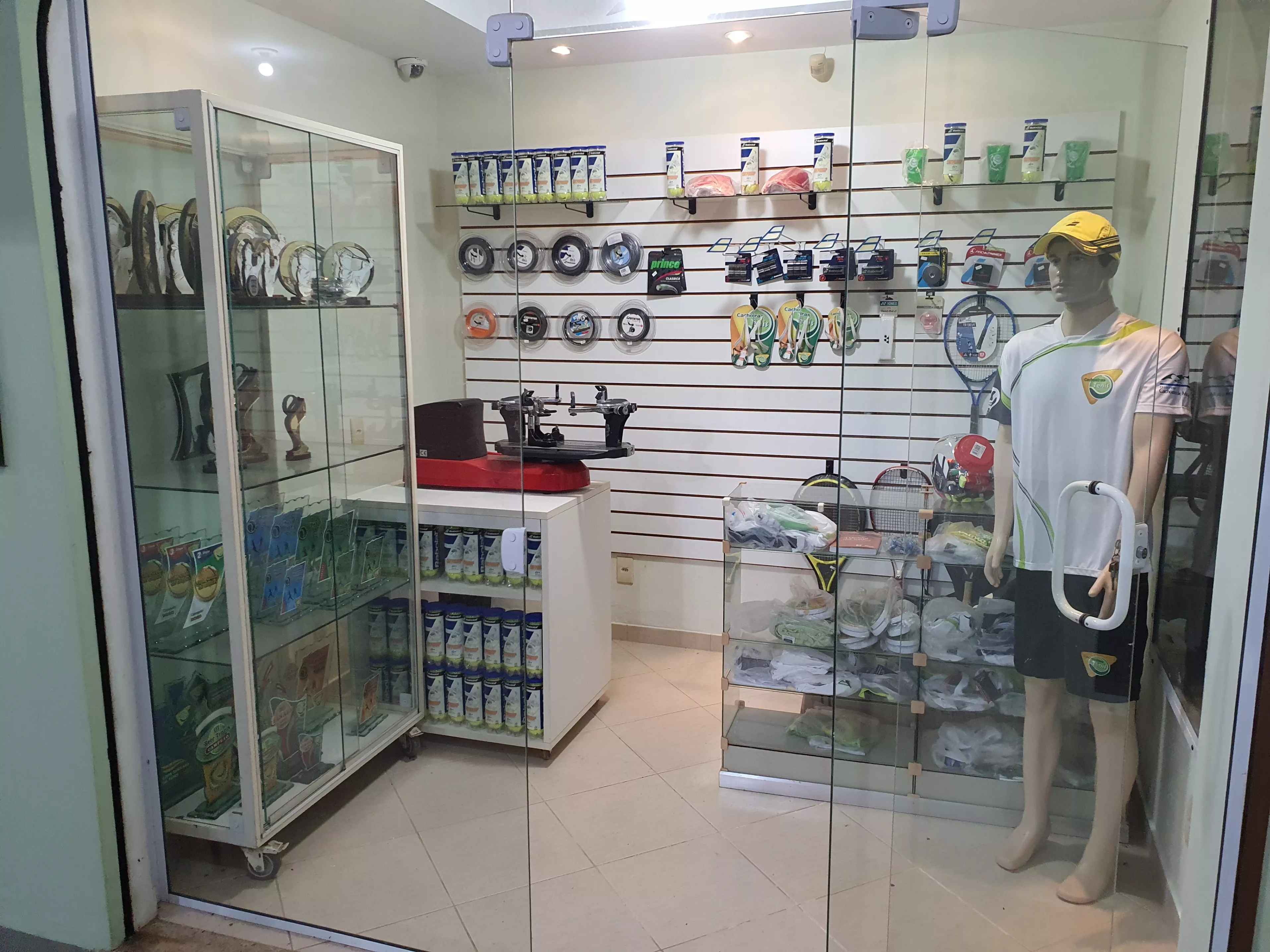 Loja: especializada em materiais para prática do tênis, com máquina de encordoamento de raquete (eletrônica).