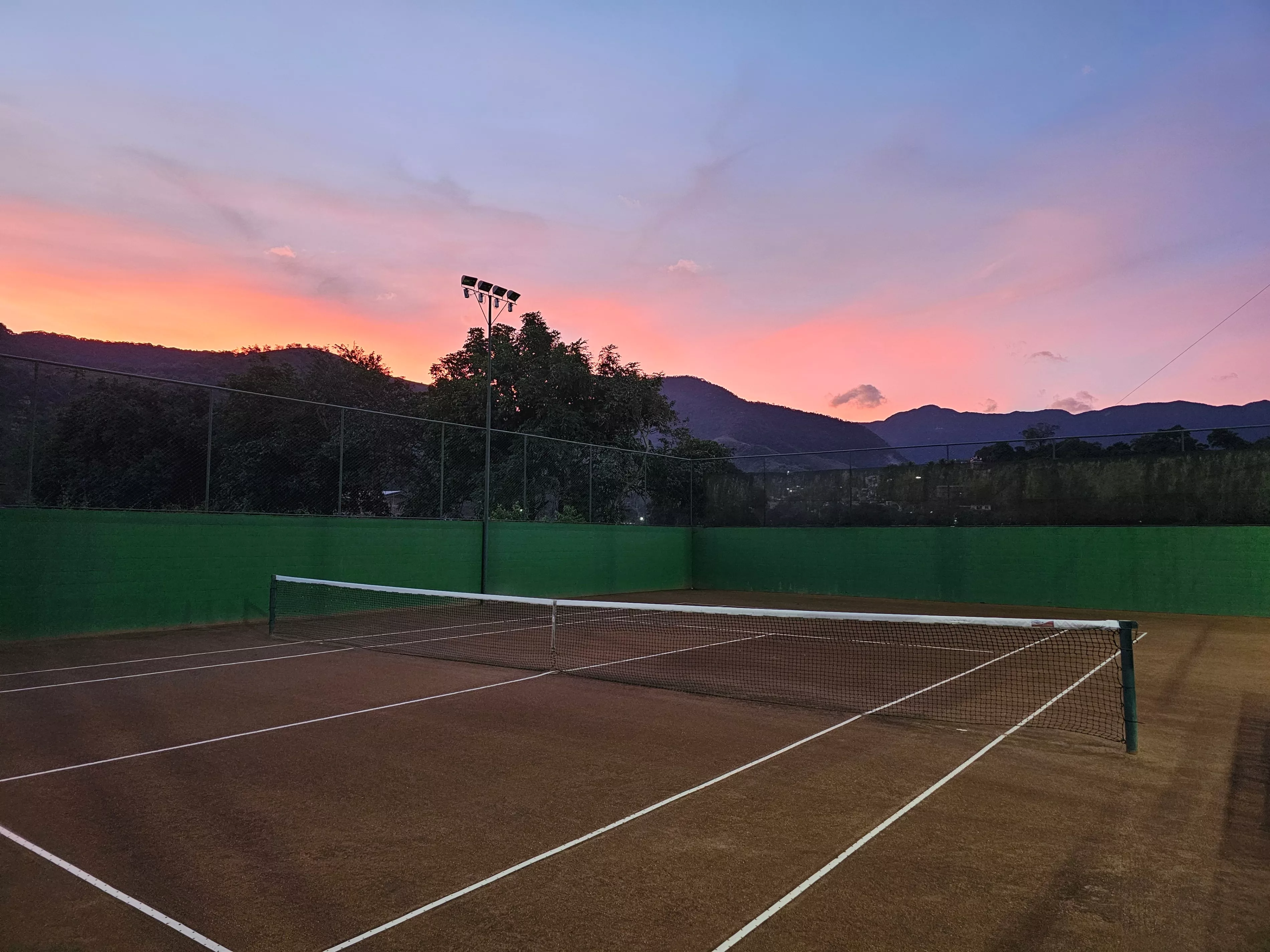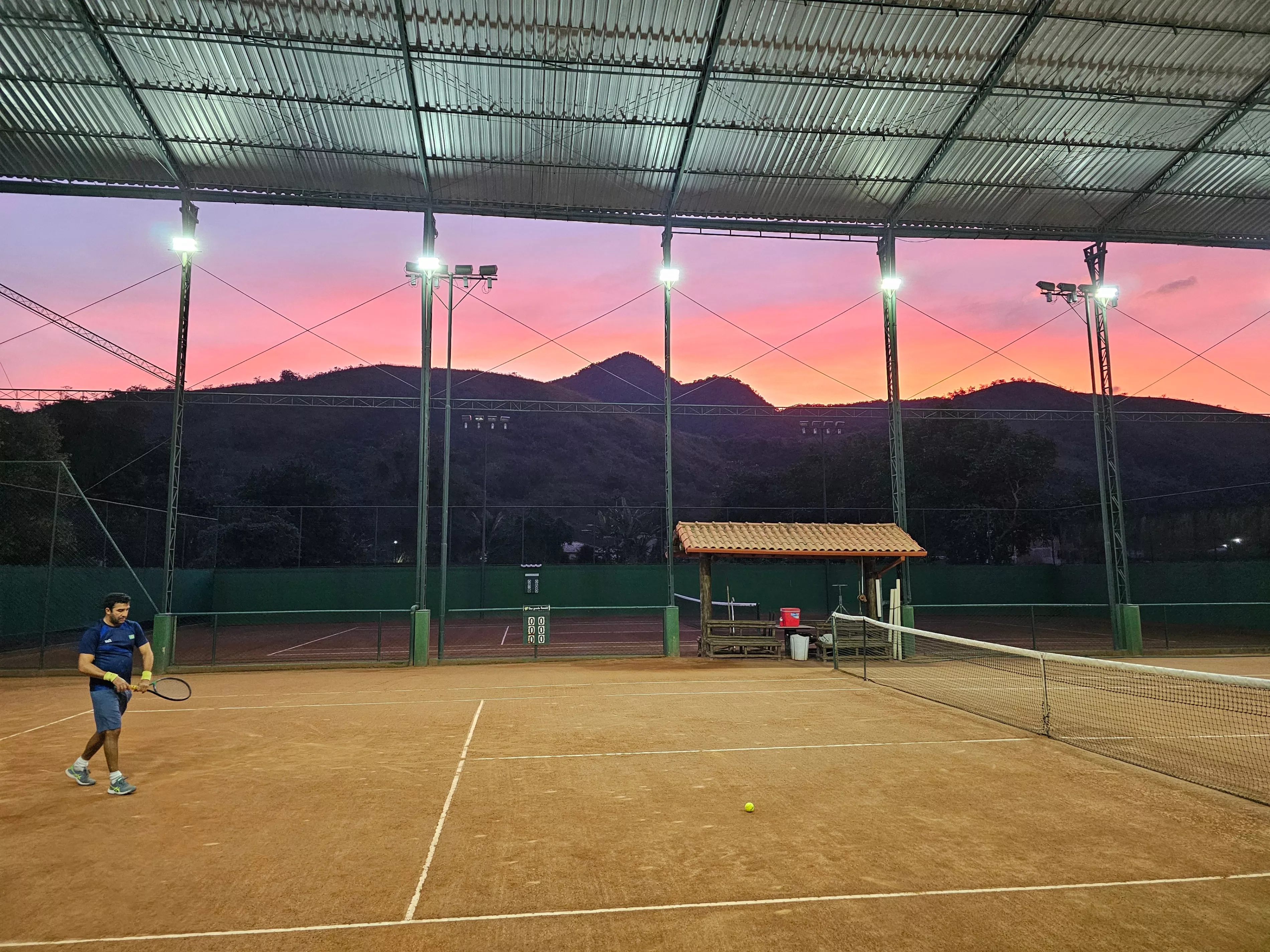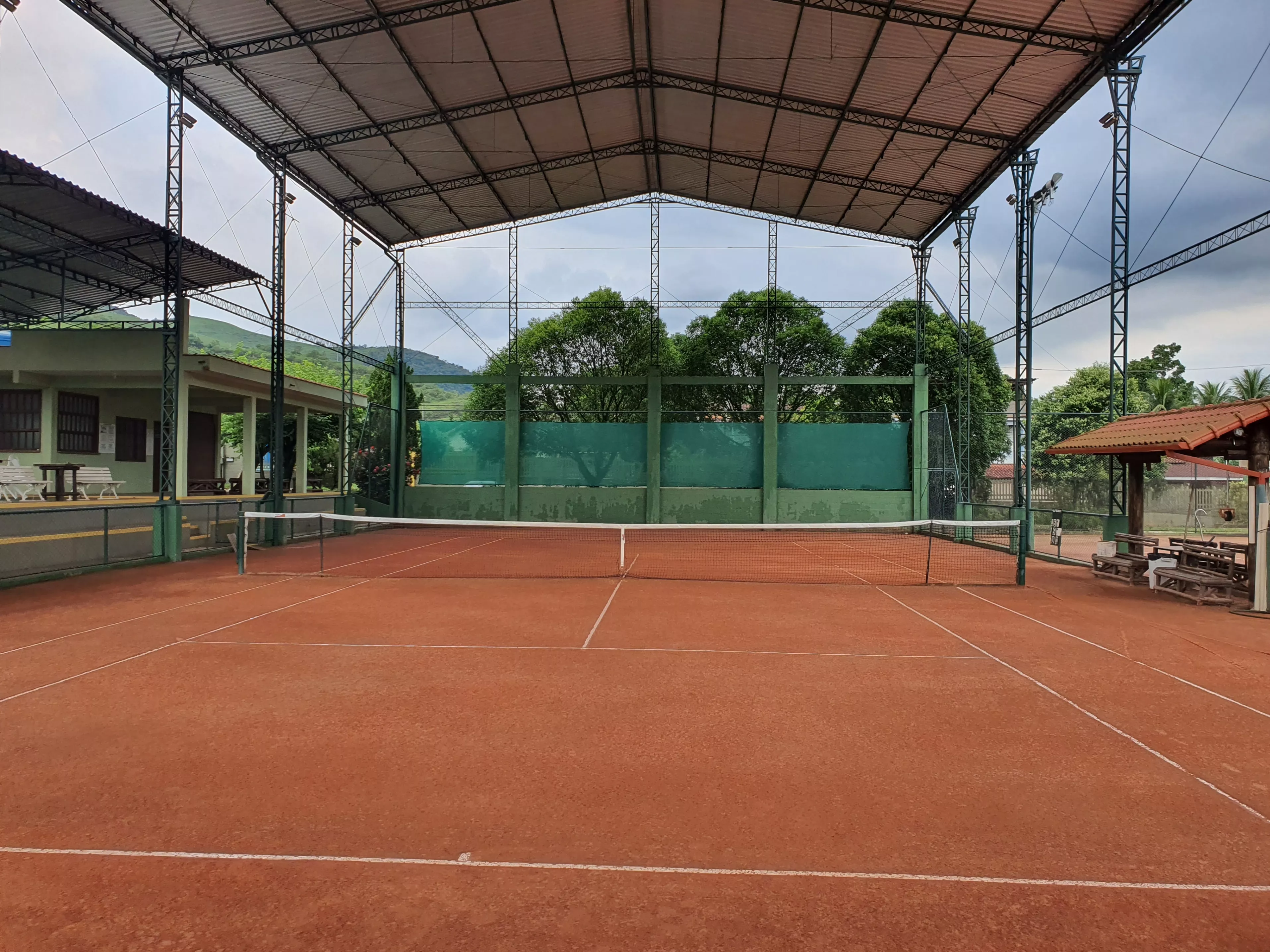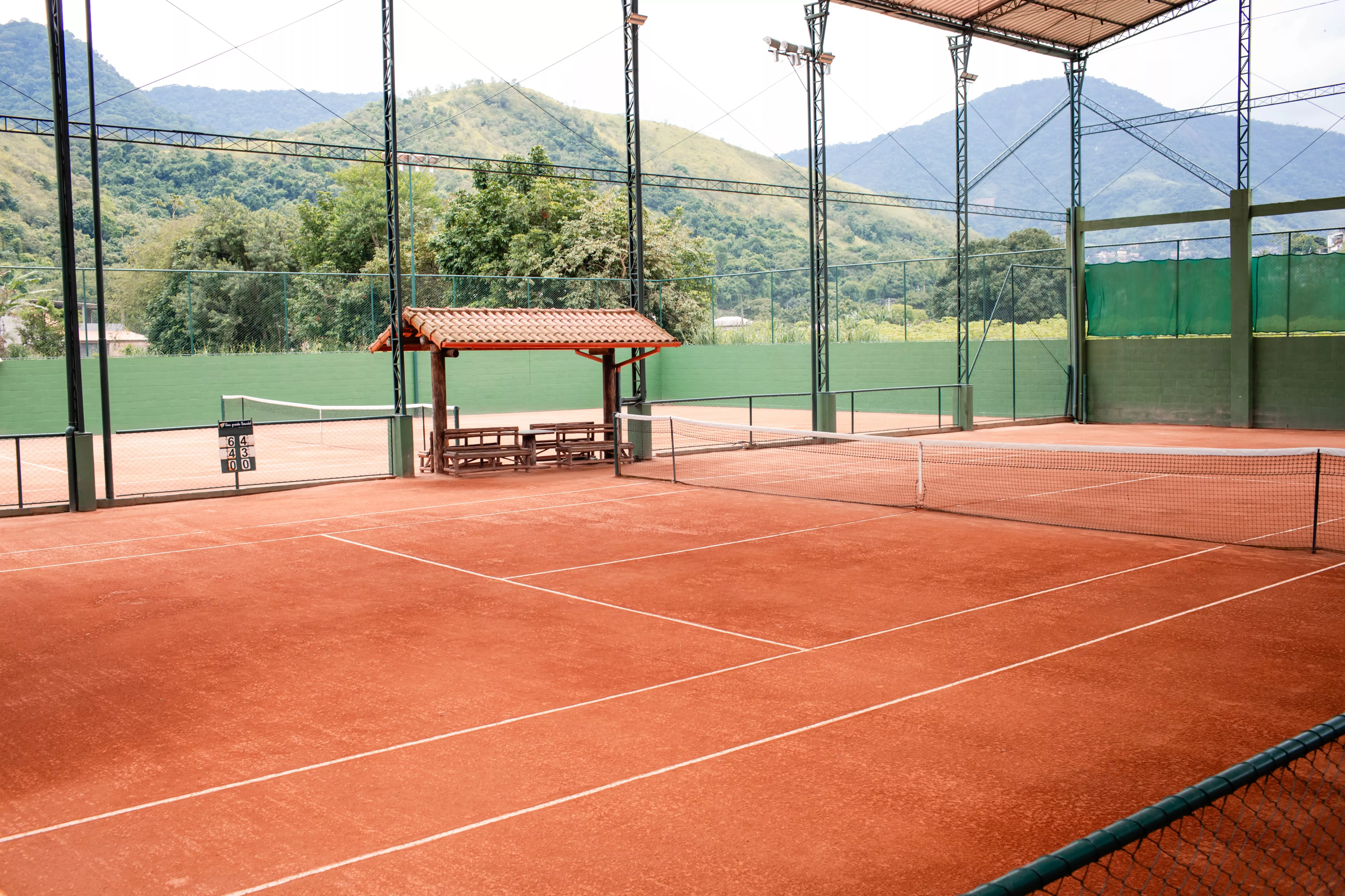 Quadras de qualidade: duas quadras de saibro de tamanho oficial, sendo uma coberta, com manutenção regular e iluminação adequada.