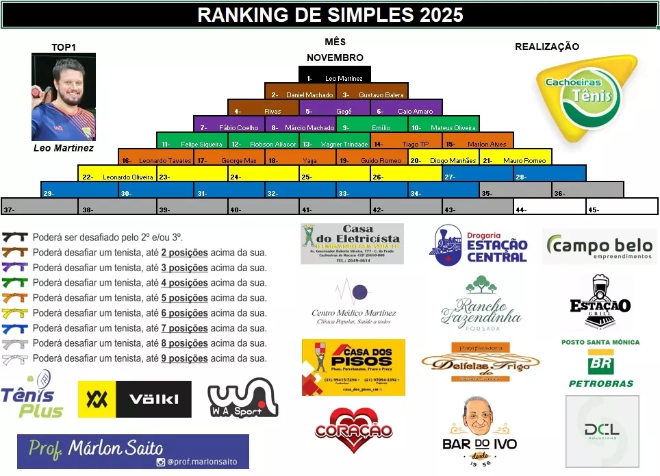 - Ranking de Simples (Sistema de Pirâmide): o tenista desafia tenistas de acordo com sua posição na pirâmide.