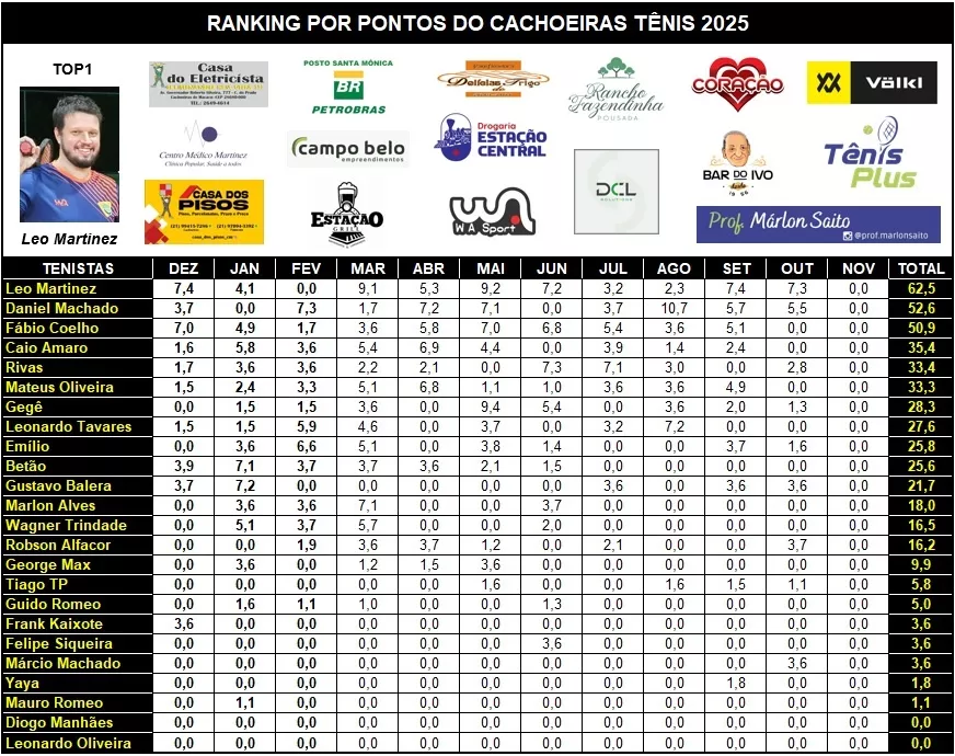 Rankings do Cachoeiras Tênis